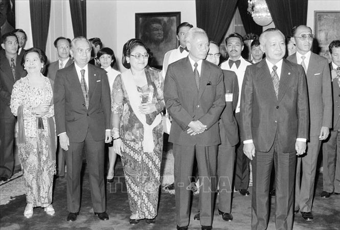 Trong ảnh: Tổng thống Suharto và phu nhân mở tiệc chiêu đãi Thủ tướng Phạm Văn Đồng nhân chuyến thăm chính thức Indonesia, tối 21/9/1978, tại thủ đô Jakarta. Ảnh: TTXVN